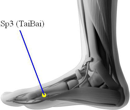 Acupressure point SP3 or Spleen 3 is the most important point in acupressure treatment for water retention cure. This point is known as the Supreme Whiteness, and it is situated on the inside of the foot, in the hollow in between the big tone and the metatarsal bone, on the side of the foot.